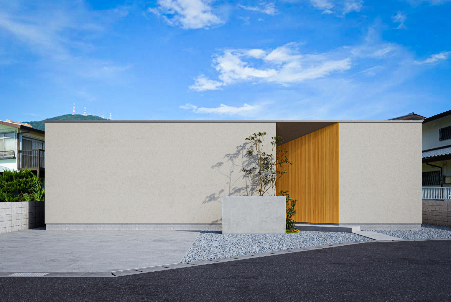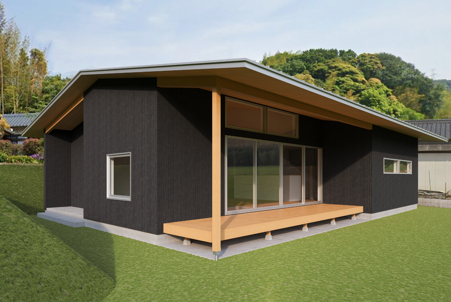 深みのある黒い外壁と、軒を支える木の柱が美しく調和した外観。和の落ち着きとモダンな洗練さを兼ね備えた佇まいは、街並みに溶け込みながらも存在感を放ちます。外壁は杉板張りとなっており、自然素材の美しさをそのまま残しました。