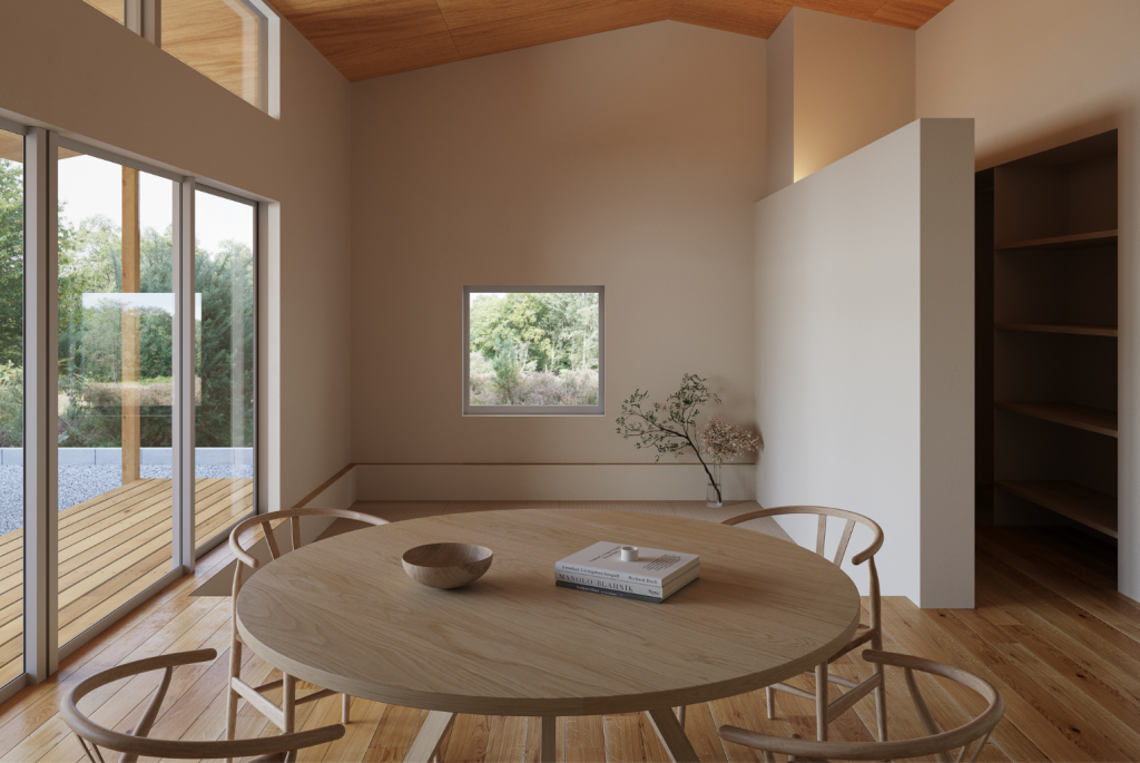 大きな窓から差し込む光と勾配天井が生む開放感。景観と一体となったリビングは、暮らしに癒しとリズムを与えてくれます。外の縁側へ自然につながる設計が、家族の暮らしや家事動線をスムーズに整えます。