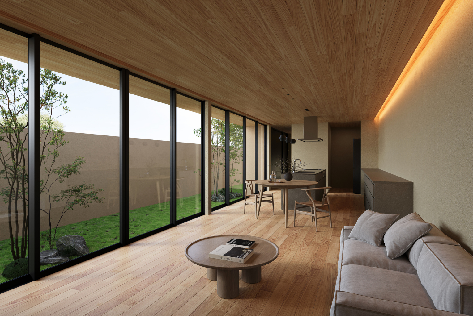 天井と床には木材の温もり、風合いのある壁仕上げ。グレートーンの外壁や家具が空間を引き締め、和モダンの美意識を一層際立たせます。細部まで計算されたデザインが、住まいの品格を高めています。