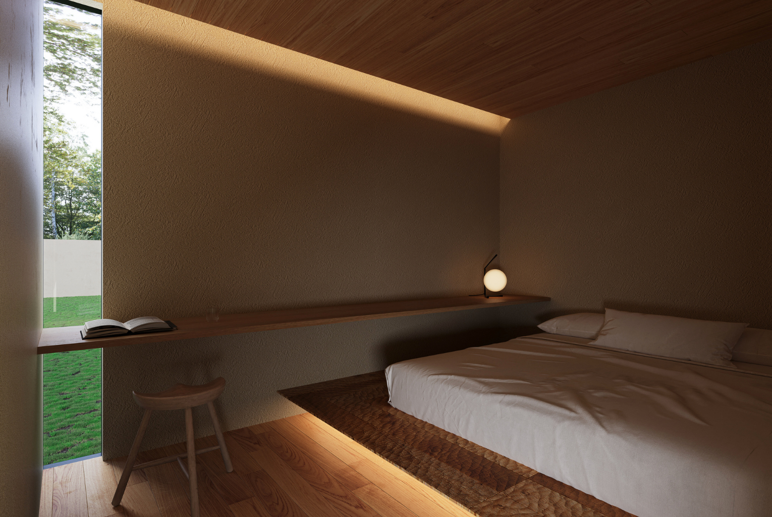 床を一段上げた設えに、足元からやさしく灯る間接照明。空間に奥行きと陰影を生み出し、縦長窓からの自然光と調和することで、旅館のような静けさと安らぎに包まれます。静かに心を整える、上質なプライベート空間です。