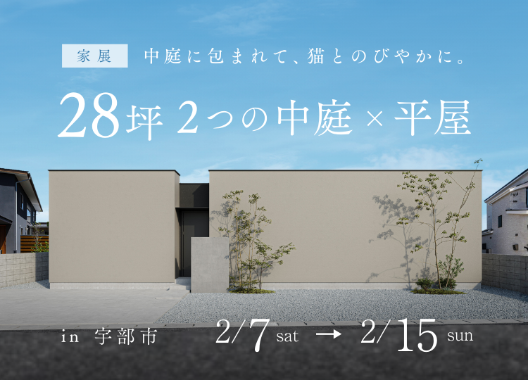 76坪の敷地に建つ28坪の平屋は、「高天井のLDK」「2つの中庭」「自然光が差し込む浴室」など、限られた面積に心地よさを詰め込んだ住まい。猫ちゃんものびのびと動けるゆとりある動線設計で、暮らすほどにその快適さを実感できます。コンパクトでありながら、贅沢な広がりを感じられる空間です。