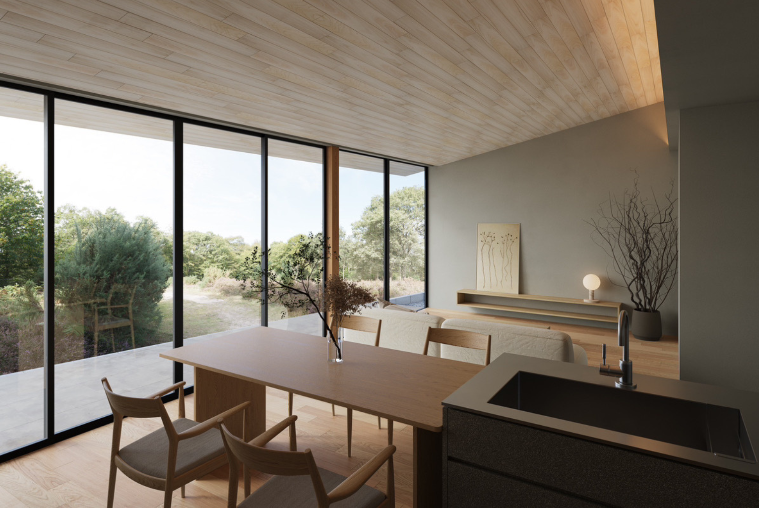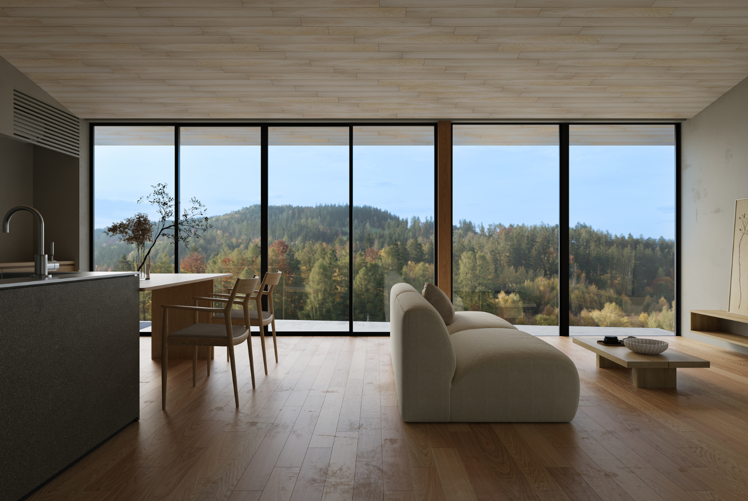 大開口の窓の先には、空と緑が広がる絶景。カーテンを開け放てば、まるで自然の中に身を置いているような感覚に包まれます。朝の光に満ちたダイニング。夕暮れに染まる空を眺める時間。