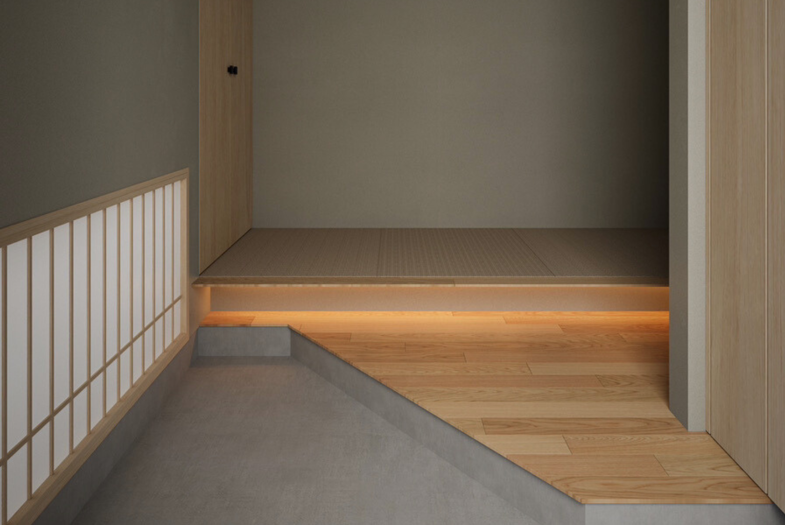 玄関には、段差を活かした畳スペースを設置。