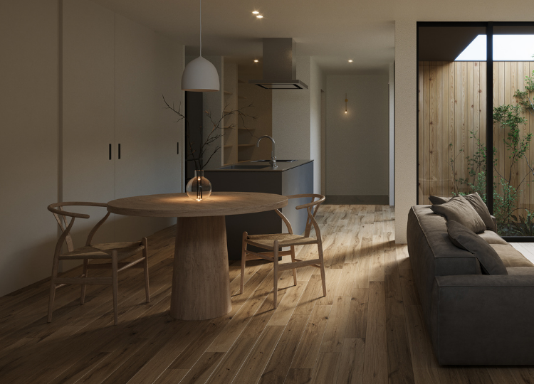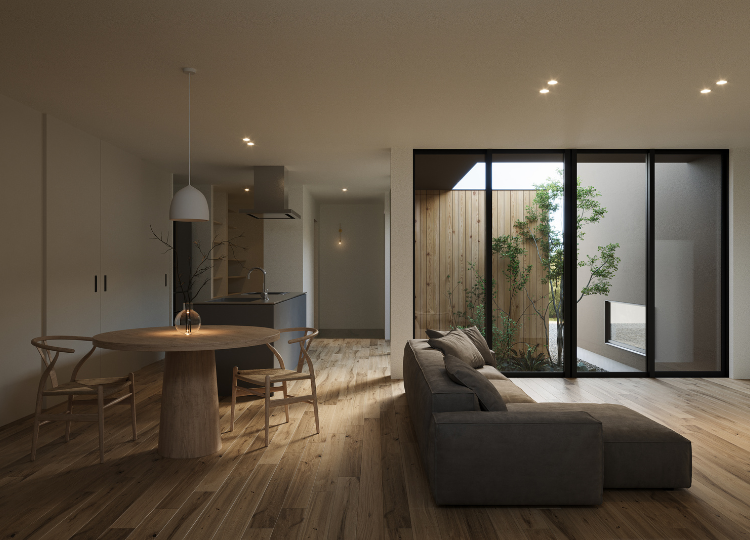 住まいの中心は、22帖のL型LDK。全面開口の窓が中庭へとつながり、内と外がゆるやかに溶け合います。